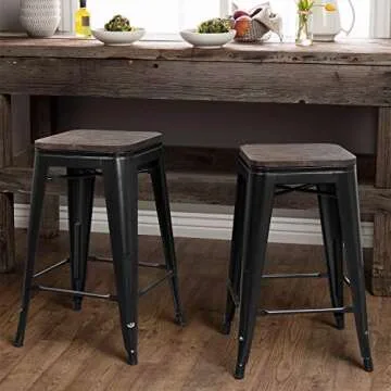 Each stool features a thick 0.78-inch wood seat, which is moisture-proof and resilient to deformation, making it ideal for various environments. With a maximum capacity of 300 lbs, you can trust that these stools provide the strength and stability needed for everyday use. The seat dimensions of 12” x 12” (D x W) and a height of 24” make them a perfect fit for any bar or counter.