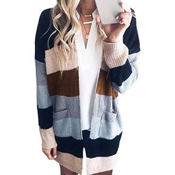 JUNBOON Women's Striped Long Sleeve Open Front Knit Cardigan Casual Pullover Sweater