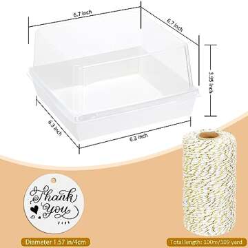 Show moreDiscover the perfect way to present your culinary creations with the JuneHeart 30 Pack Paper Charcuterie Boxes. These elegantly designed disposable food containers are exceptional for showcasing an array of delights from savory treats to decadent desserts. Each box measures 6.7 x 6.7 x 3.95 inches and comes paired with a clear protective lid, allowing a beautiful view of what’s inside while ensuring maximum freshness and flavor retention. The set includes 30 white paper boxes, 30 clear lids, and 100 meters of delightful yellow and white cotton rope to tie your stylish presentations together seamlessly. Perfect for any occasion, these boxes are not just practical but also elevate your gifting experience!