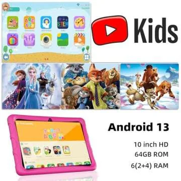 JUNINKE Kids Tablet 10 inch, Android Tablet for Kids with Case,64GB ROM 512GB Expansion, Quad Core Processor, 1280x800 IPS Screen, GPS, WiFi, Dual Cameras, Bluetooth, Long Life Battery