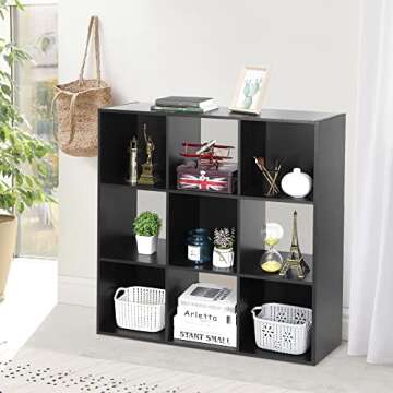 The 9 cube design offers ample storage space for various items. Whether you're looking to declutter your bookshelves, sort out toys, or showcase decorative pieces, this storage organizer can do it all. The black finish adds a sleek touch, making your items pop while ensuring your space remains tidy and organized.