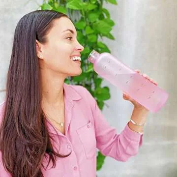 JUST ADD WATUR Motivational Water Bottle with Time Marker Reminder, BPA Free Frosted Tritan Plastic, Leakproof and Drop Resistant, 1 Liter 32 Oz (Pink)