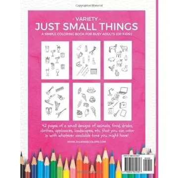 Show more Unwind and discover the joys of creativity with the "Just Small Things" coloring book by Julianne Colors. Perfectly designed for both busy adults and kids, this delightful coloring book invites you to escape the hustle and bustle of everyday life. With pages brimming with whimsical illustrations of food, makeup, animals, and everyday objects, each drawing serves as an oasis of tranquility, encouraging relaxation and mindfulness. The simplicity and charm of the designs make it a stress-free activity that anyone can enjoy, regardless of their artistic skill level. This book isn't just about coloring; it's about reconnecting with your inner artist and providing yourself with a serene space to recharge your mind and spirit.