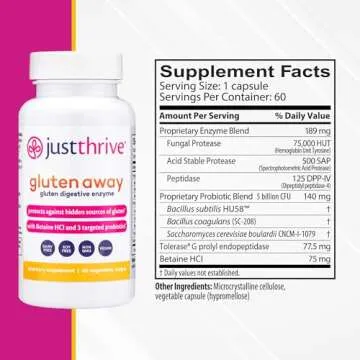 Show moreIntroducing the ultimate solution for anyone looking to safeguard their health against gluten exposure: Gluten Away. This exceptional product is crafted by Just Thrive, a trusted name in the world of gut health and probiotics. Gluten Away is designed with a unique blend of powerful probiotics and digestive enzymes tailored specifically to help men and women combat hidden sources of gluten that can disrupt their daily lives.