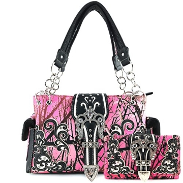 Show moreIntroducing the exquisite Justin West Camouflage Tree Branches Bling Rhinestone Cross Wings Buckle Crossbody Chain Messenger and Purse – the ultimate blend of style, functionality, and flair. Designed for the fashionista who craves both practicality and pizzazz, this stunning purse is not just an accessory; it's a statement piece. The captivating camouflage design with dazzling rhinestones is a testament to modern chic, making it the perfect companion for any outfit. With dimensions of 14" X 9" X 4.5", it's spacious enough to hold all your essentials while maintaining a compact and lightweight profile, ideal for day-to-night transition.