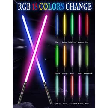 Show more Step into a world of adventure and imagination with the jvmuSaber RGB Lightsaber, a stellar product that brings the magic of the Star Wars universe right into your hands. Designed to captivate fans of all ages, this incredible lightsaber features 15 vibrant colors and 3 distinct sound modes, allowing you to customize your experience like never before. Measuring an impressive 40 inches in length, the jvmuSaber stands out with its premium construction using aerospace aluminum alloy, ensuring durability and comfort during battle. The exclusive handle design provides a smooth and enjoyable grip, making it perfect for hours of play.