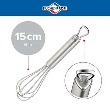 Show moreIntroducing the Küchenprofi Stainless Steel Hand Whisk – your ultimate kitchen companion for all culinary adventures! Measuring 6 inches in length, this versatile whisk is specifically designed to make everyday cooking a breeze. Whether you're beating eggs for a fluffy omelet, blending batters for pancakes, or stirring up sauces, this multipurpose tool meets all your whipping needs. Crafted from superior quality stainless steel, it ensures exceptional durability while resisting corrosion and maintaining its shine for years to come.