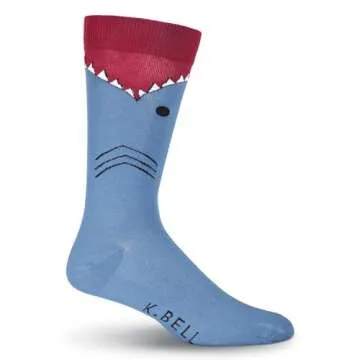 K. Bell Socks Men's Funny Animal Novelty Crew Socks, White Shark (Slate Blue), Shoe Size: 6-12