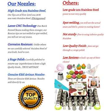 Show more Elevate your baking game with the K&S Artisan Russian Piping Tips Deluxe Cake Decorating Supplies Set. This comprehensive kit empowers both novice and experienced bakers to create stunning desserts with professional flair. Featuring 34 icing piping tips crafted from high-grade pure 304 stainless steel, this set is engineered for durability and safety, ensuring no rust or seams will compromise the integrity of your culinary creations. The kit includes 30 disposable frosting bags and a variety of specialized tips, including 2 ball tips, 2 leaf tips, and 2 ruffle tips, allowing you to bring your artistic vision to life effortlessly.