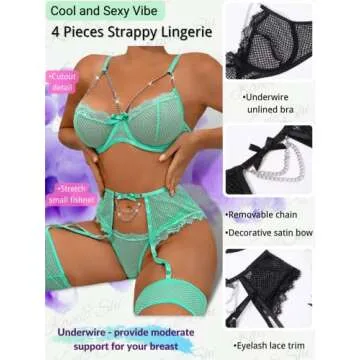Kaei&Shi Garter Belt Lingerie Set - Underwire Chain Strappy Eyelash Fishnet with Thigh Cuffs
