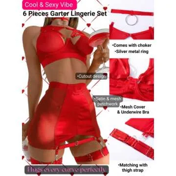 Kaei&Shi Garter Lingerie For Women,Sheer Mesh Choker Strappy Cutout Exotic Sexy Lingerie, High Waisted Thigh Band Skirt G String Matching 4 Piece Lingerie Set Boudoir Red Medium