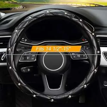 KAFEEK Diamond Soft Leather Steering Wheel Cover with Bling Bling Crystal Rhinestones, Universal 15 inch Anti-Slip