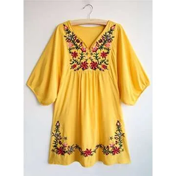 Kafeimali Summer Dress V Neck Mexican Embroidered Peasant Women's Dressy Tops Blouses (Yellow)