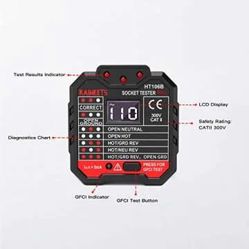 KAIWEETS Outlet Tester 48-250V, Receptacle Tester with Voltage Display, GFCI Tester CAT II 300V, Includes 7 Visual Indications and Wiring Legend for Home & Professional Use