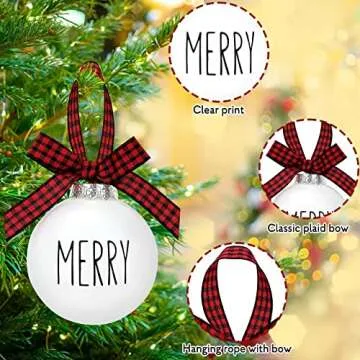 Show more Embrace the spirit of Christmas with our exquisite set of 12 matte white plastic Christmas ornaments. Measuring 3 inches each, these ornaments are expertly crafted to adorn your tree, bringing a touch of elegance to your festive decor. Made from high-quality, thick plastic, they offer durability and versatility, allowing you to use them year after year. Each ornament features a rustic word printed on one side, infusing a charming farmhouse style into your holiday atmosphere.