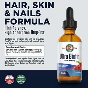 KAL Ultra Biotin 10000mcg DropIns, Liquid Biotin Drops, Hair Growth Supplement, High Potency Vitamin B7, Healthy Hair, Skin, Nails and Energy Support, Natural Mixed Berry Flavor, Approx. 59 Serv, 2oz