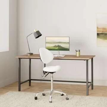 Show more Explore the perfect blend of comfort, style, and practicality with the Kaleurrier Ergonomic Rolling Swivel Saddle Stool. Designed for versatility, this hydraulic height-adjustable saddle chair transforms any workspace—be it a salon, clinic, lab, or kitchen—into a haven of productivity and ease. Its sleek white finish paired with a supportive backrest guarantees not only aesthetic appeal but also a focus on your well-being during prolonged hours of sitting. Whether you’re drafting, styling hair, or conducting meticulous lab work, this stool is your reliable companion.
