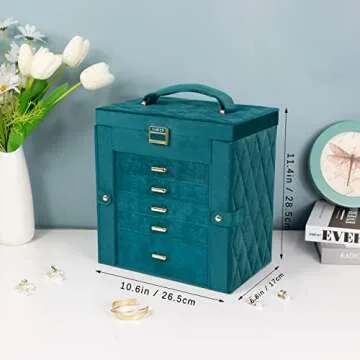 KAMIER Jewelry Box for Women, 6-Layer Large Jewelry Organizer Box with Mirror & 5 Drawers for Rings, Earrings, Necklaces, Bracelets,Velvet Peacock Blue