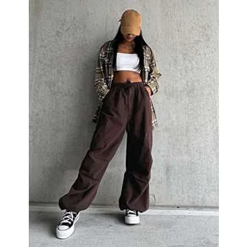 KAMISSY Women Causal Baggy Cargo Pants Parachute Low Waist Hip Hop Jogger Sweatpants with Pocket Drawstring Wide Leg Trousers Brown