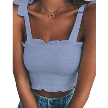 Show moreStep out in style with the KAMISSY Women's Frill Smocked Crop Tank Top. Crafted from premium lightweight fabric, this stunning light blue tank top is designed with a trendy smocked bodice that provides a perfect fit. The tiered frill hem adds a playful touch, while the adjustable tie shoulder straps make it easy to customize the look to your liking, ensuring comfort and style all day. Ideal for warm days and summer nights, this crop tank top pairs beautifully with your favorite high-waisted jeans or skirts, making it a versatile addition to your wardrobe.