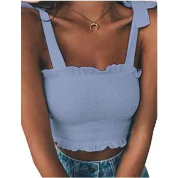 KAMISSY Women's Frill Smocked Crop Tank Top - Light Blue Tie Shoulder Vest