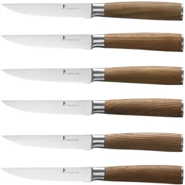 Show moreIntroducing the Kangdelun Natura Series 4.5” Serrated Steak Knife Set, a stunning and essential addition to your kitchen or dining experience. Crafted with precision and elegance, this set includes six beautifully designed knives made from ultra-sharp high-carbon stainless steel. Each knife features a naturally finished wooden handle made from premium Fraxinus wood, providing a comfortable grip while enhancing your dining aesthetics. These knives are not only visually appealing but also engineered for superior functionality, making them the perfect choice for steak lovers and culinary enthusiasts alike.