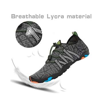Show moreIntroducing the Kararao Women's Barefoot Water Shoes, your ultimate companion for aquatic adventures! Designed with both style and functionality in mind, these breathable aqua shoes are perfect for a myriad of activities, whether you’re splashing around at the beach, kayaking down a river, or practicing yoga by the pool. Made from ultra-lightweight Lycra material, the shoes provide a snug, glove-like fit while ensuring maximum comfort and flexibility. Experience the joy of quick-drying capabilities and easy drainage that keep your feet feeling fresh and energized.