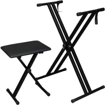 Show moreIntroducing a perfect blend of functionality and style, this X-style keyboard stand and bench set is designed with the modern musician in mind. Crafted from durable steel, each component is built to withstand the test of time, ensuring your digital piano or keyboard remains securely in place during performances or practice sessions. Its powder-coated finish not only enhances durability but also makes it rust-proof, allowing you to use it in various environments without worry. With an innovative adjustable mechanism, the keyboard stand offers six different height settings, while the accompanying piano bench boasts three levels of adjustability. This flexibility ensures that musicians of all heights can find their ideal playing position comfortably.