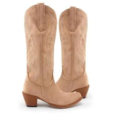 KaroNairy Women Cowboy Boots Faux Suede Embroidered Pointed Thick Heeled Western Wide Calf Cowgirl Ponited Toe Mid Calf Boots Tan7.5