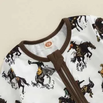 Show more Introducing the Karwuiio Baby Boy Girl Western Clothes Cow Print Long Sleeve Romper Jumpsuit, the perfect blend of style and comfort for your little one! Designed with a charming cow print, this adorable romper is not only cute but also functional. The soft cotton blend fabric ensures your baby stays cozy while looking fashionable in a unique western-themed outfit.