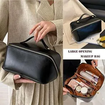 Katadem Travel Makeup Bag,Large Opening Makeup Bag,Portable Makeup Bag Opens Flat for Easy Access, Toiletry Bag,PU Leather Makeup Bag,Large Cosmetic Organizer for Women (Black)