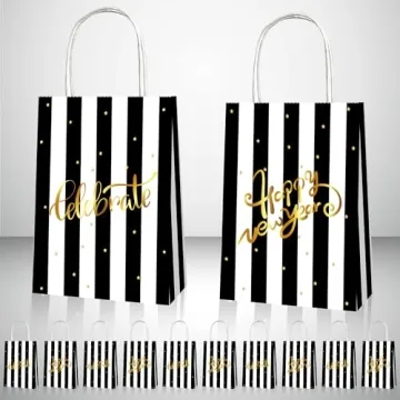 Show moreWelcome the New Year in style with the KatchOn Happy New Year Gift Bags! This versatile pack of 12 beautifully designed gift bags adds an elegant touch to your 2025 New Year celebrations. Crafted specifically for New Year’s Eve, these bags not only add charm but also practicality to your festivities. Measuring at a convenient 6in x 3in x 8in when opened, they provide ample space to accommodate a variety of treats, goodies, or special surprises for your guests. Made from premium, eco-friendly craft paper, these bags are sturdy enough to hold anything from candies to small gifts, ensuring they remain intact throughout your event, making them a must-have addition to your party supplies.