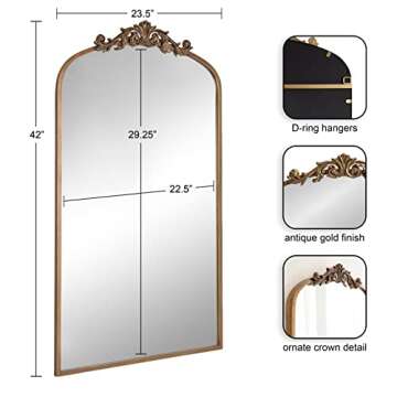 Show more Introducing the **Kate and Laurel Arendahl Glam Arched Tall Panel Mirror**, a stunning blend of elegance and functionality designed to enhance your home decor. Featuring an exquisite baroque-inspired frame adorned with a decadent garland overlay, this mirror is not just a reflection tool but a statement piece that brings a sophisticated touch to any space. With its grand arched shape and shimmering gold finish, it adds a sense of grandeur perfect for both traditional and modern aesthetics. Crafted from resilient iron, the frame promises durability while maintaining its enchanting allure over the years.