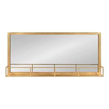 Show moreElevate your home decor with this stunning decorative metal framed mirror, an exceptional addition to any kitchen, bar, or entryway. Crafted by Kate and Laurel, this piece mirrors sophistication and functionality, making it an ideal choice for those with a keen eye for aesthetic appeal. Not only does it reflect your unique style, but it also offers a practical solution for organization. With a generous attached metal shelf measuring 40 inches wide and 5 inches deep, it provides ample space for displaying toiletries, cups, spices, or cherished framed photos.