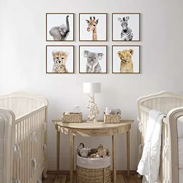 Show more Transform your living space with stunning TRANSITIONAL CANVAS WALL ART from the renowned Amy Peterson Art Studio. This exquisite set of 6 safari-themed canvases features vibrant prints of adorable animals including elephants, giraffes, zebras, cheetahs, koalas, and sleepy lions, each measuring a charming 13 inches by 13 inches. Perfect for nurseries or children's rooms, these pieces serve not just as decor but as delightful companions for your little ones as they grow and develop their imagination.