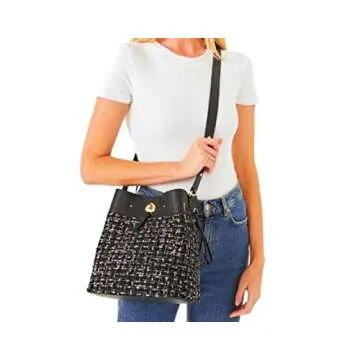 Elevate your accessory game with the Kate Spade New York Marti Tweed Large Bucket Shoulder Tote Bag. This stunning bag, in a chic black multi tweed, combines timeless elegance with contemporary flair. Designed with the modern woman in mind, it features a spacious interior perfect for carrying your daily essentials, whether you're off to work or out for a weekend adventure. The stylish bucket shape makes it versatile enough to complement any outfit while the signature Kate Spade branding adds...