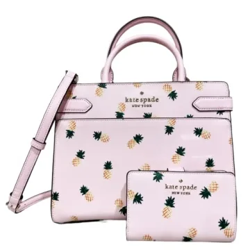Show moreIntroducing the KATE SPADE Staci Pineapple Medium Top Zip Satchel, a chic accessory that effortlessly combines style and functionality. With its vibrant Pink Multi exterior adorned with playful pineapple motifs, this satchel is perfect for summer outings or adding a splash of fun to your everyday wardrobe. The spacious interior features ample room for your essentials, while the secure top zipper ensures your belongings stay safe. Paired with the Bundled Colada Medium Compact Bifold Wallet, also done in a cheerful pineapple theme, you get a harmonious set that radiates joy and style. Both pieces are crafted from durable materials for longevity, making them a delightful choice for fashion-forward individuals!