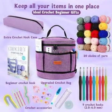 The kit includes 9 crochet hooks, 20 skeins of yarn, a multifunctional crochet bag, detailed instructions, and additional accessories.