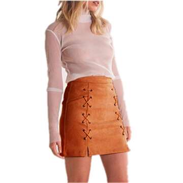 katiewens Women's Classic High Waist Lace Up Bodycon Faux Suede A Line Mini Pencil Skirt