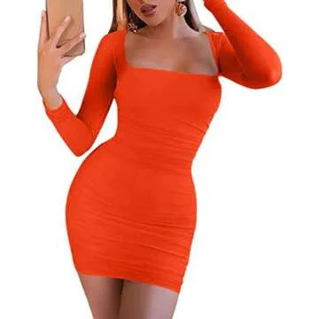 Details:The basic bodycon mini dress features ruched details, long sleeve, style with square neck detail. Pefect for fall winter spring. Bodycon fitted