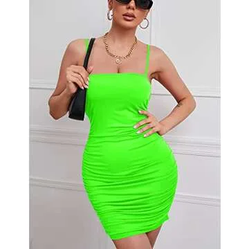 Kaximil Women's Sexy Bodycon Spaghetti Strap Ruched Mini Club Dresses,Small,Light Green