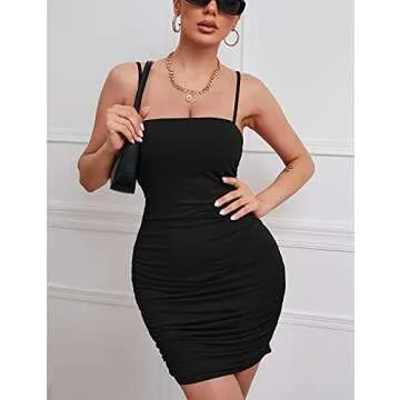 Show moreIntroducing the Kaximil Women's Sexy Bodycon Spaghetti Strap Ruched Mini Club Dress, a must-have addition to every fashion-forward woman's wardrobe. Crafted from a soft, stretchy, and double-layered fabric, this dress embodies comfort while accentuating your curves. With a flattering ruched design, it enhances your silhouette, making you stand out at any event. The adjustable spaghetti straps and sleeveless cut offer versatility while ensuring a secure fit. Perfect for warm weather, this dress is suitable for summer, spring, and fall, allowing you to enjoy its stylish appeal year-round.