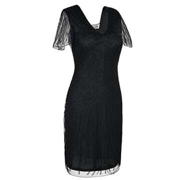 Show moreStep into the glamorous world of the 1920s with the Kayamiya Women's Gatsby Dress. This stunning flapper dress combines a sophisticated V-neck front and back design to create an alluring silhouette that flatters every figure. The chic short sleeves and a convenient side zipper closure ensure you’ll glide effortlessly through any event, whether it's a lavish evening party or an elegant wedding cocktail. The dress is adorned with exquisite high-quality beads, each handcrafted to perfection, making this an heirloom piece in your wardrobe that captures the spirit of the Roaring Twenties.