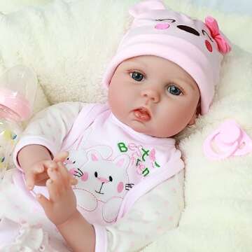 Show more Introducing the Kaydora Reborn Baby Doll, a stunning 22-inch lifelike representation of a newborn baby that is crafted to perfection. This doll captures the essence of a real infant, featuring a soft and flexible body that allows for posing in various adorable ways. The intricate designs and attention to detail make the Kaydora doll not just a toy but a cherished companion for your child. It's a delightful addition to any play set and will inspire hours of nurturing and imaginative play.
