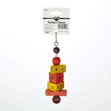 The Perfect Chew for pet rats includes wood balls, wood cheese wedges, a wood log and a block in brilliant yellow, red and purple colors