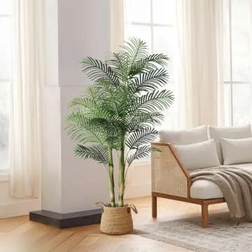Show more Transform your living space into a tropical paradise with our exquisite artificial golden cane palm tree. This stunning faux plant is meticulously designed to replicate the lifelike beauty of real palm trees, making it nearly indistinguishable from the genuine article – even upon close inspection. Standing at a majestic height of 6 feet, this palm tree is perfect for adding a touch of greenery to any room in your home or office.