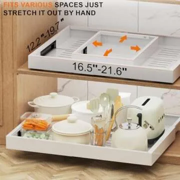 Show moreIntroducing the kbrains Expandable Pull Out Cabinet Organizer—your ideal solution for maximizing storage space in your kitchen or pantry! This innovative organizer features an expandable design, adapting seamlessly to a variety of cabinet sizes with adjustable depth ranging from 16" to 22" and width from 12" to 20". It transforms deep cabinets into accessible storage, ensuring that you can reach everything you need, from pots and pans to spices and pantry items, with ease. The sleek white finish adds a touch of modern style to your kitchen while enhancing functionality. Say goodbye to messy cabinets and hello to organized bliss!