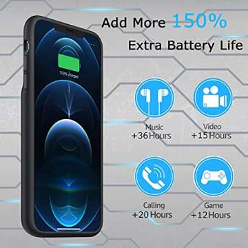 Show more Introducing the KCKEM Battery Case for iPhone 12 Pro Max, a top-of-the-line accessory specifically designed for users seeking enhanced battery life without compromising on protection. With its robust 8500mAh lithium polymer capacity, this sleek and stylish battery case doubles your phone's lifespan, providing an impressive 200%+ extra battery life. Equipped with advanced functionality, it allows you to enjoy 73 hours of music playing, 42 hours of talk time, 20 hours of internet use, and 25 hours of video playback. Compatibility is key; this smart battery case is optimized exclusively for the iPhone 12 Pro Max, ensuring a snug fit to keep your device charged and ready for action wherever you go.