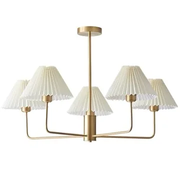 Show more Transform your living space with the stunning KCO Lighting 5-Lights White Pleated Fabric Pendant Light, a true masterpiece in mid-century modern design. This exquisite chandelier features a unique creative pleated fabric design that captures attention and elevates the ambiance of any room. The brilliant gold-finished metal body adds a captivating touch of elegance, while the soft, radiant glow emitted from the white pleated fabric lampshade creates a warm, inviting atmosphere without the harsh glare often found in other fixtures. Its delicate texture, reminiscent of the graceful flow of a mountain girl's skirt, showcases a beautiful blend of simplicity and sophistication.