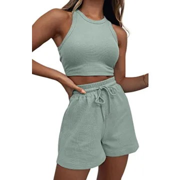 Show moreStep into summer's embrace with the KDF Two Piece Lounge Sets for Women, featuring a stylish and comfortable design that seamlessly blends relaxation with contemporary flair. Crafted from a breathable, skin-friendly fabric, this ensemble showcases a delightful waffle pattern in a vibrant green hue. The set includes a sleeveless crop top with a round neck and racerback, offering the perfect amount of stretch for all-day comfort. Paired with relaxed-fit shorts that come with a convenient drawstring waistband and two side pockets, this outfit is designed for versatility, making it perfect for lounging, workouts, or fun outings on warm days.